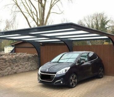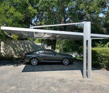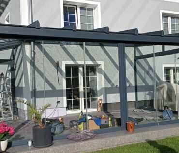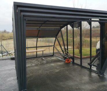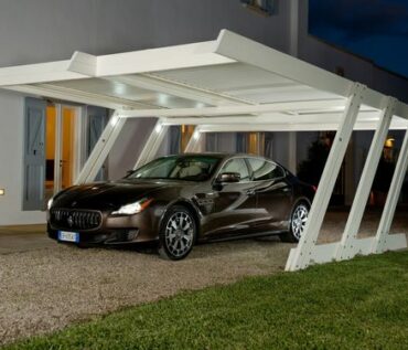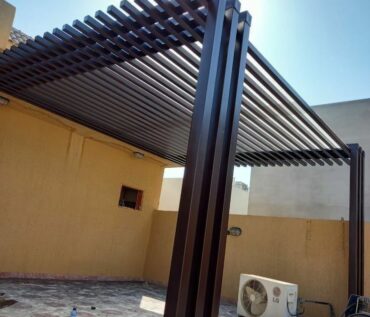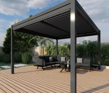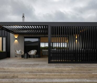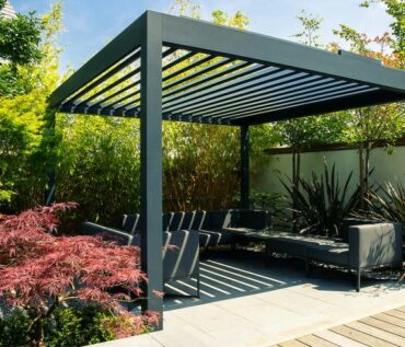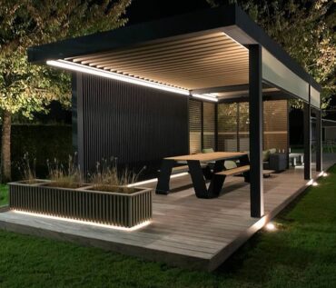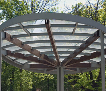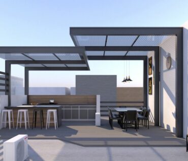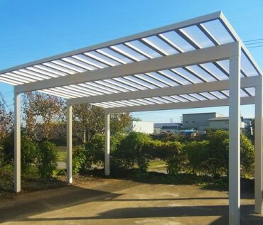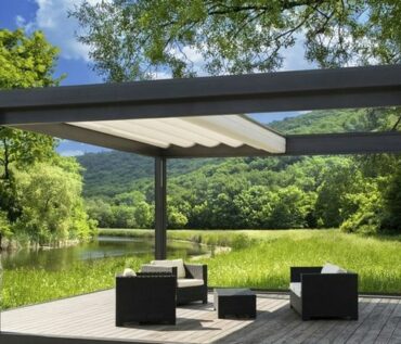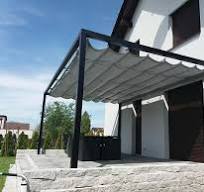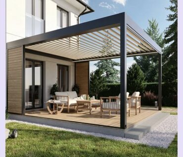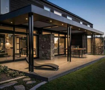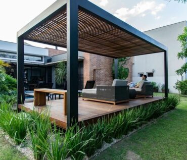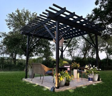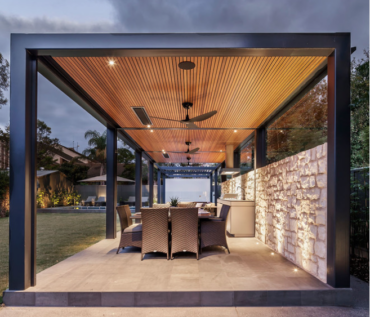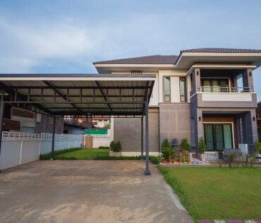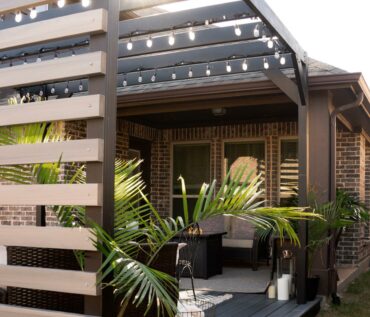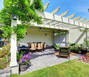 Covered patio area with outside chairs in the backyard garden. House exterior. Northwest, USA
